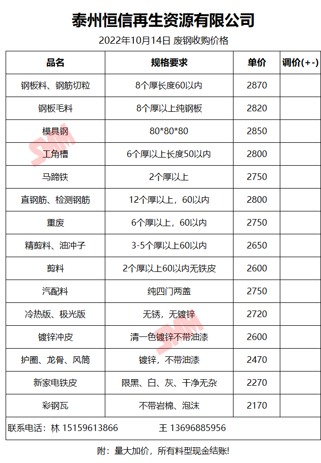 10月14日泰州恒信再生 废钢收购报价