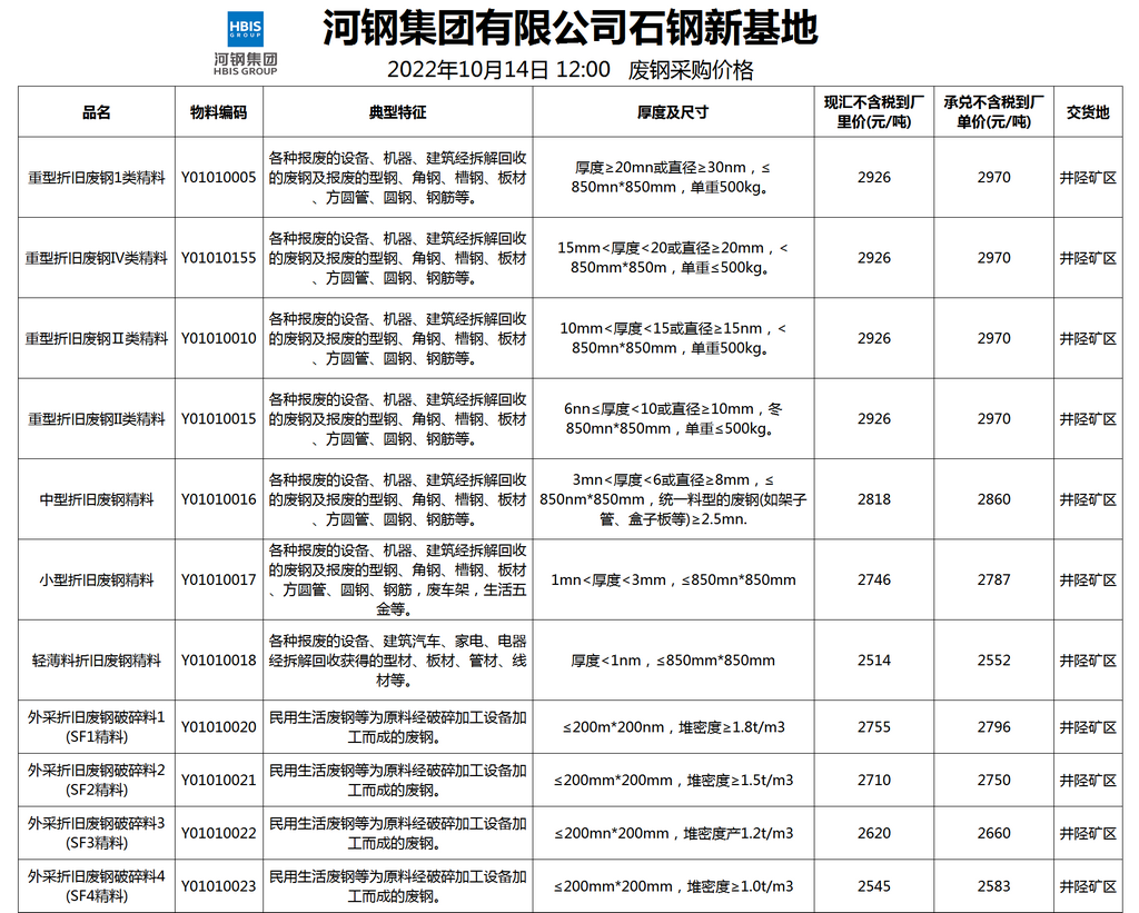 今日 河钢石钢新基地 废钢采购报价已更新,有货的朋友欢迎联系我们!