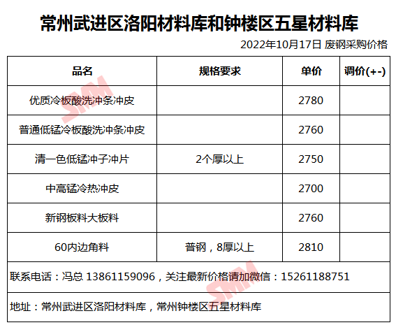 10月17日常州武进区洛阳和钟楼区五星材料库 废钢采购报价