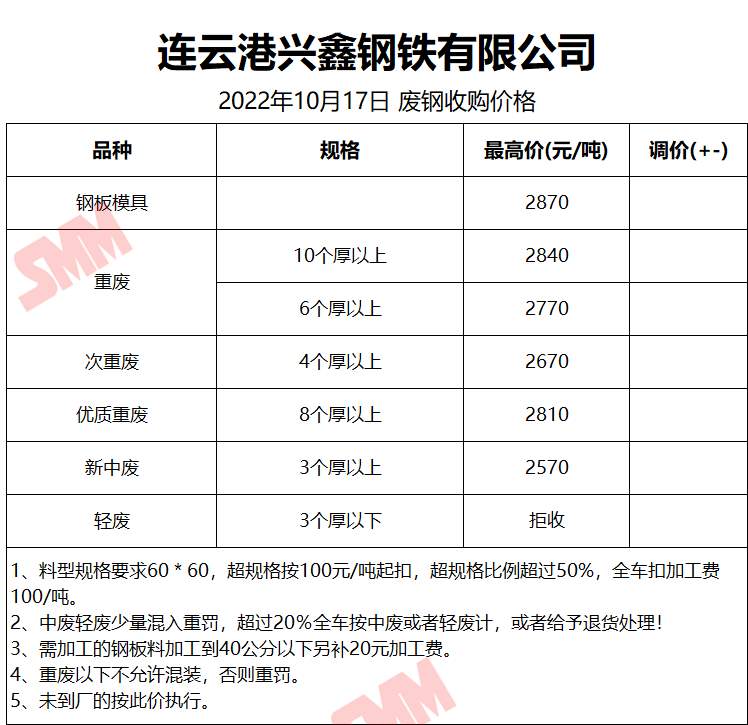 10月17日连云港兴鑫钢铁 废钢收购报价