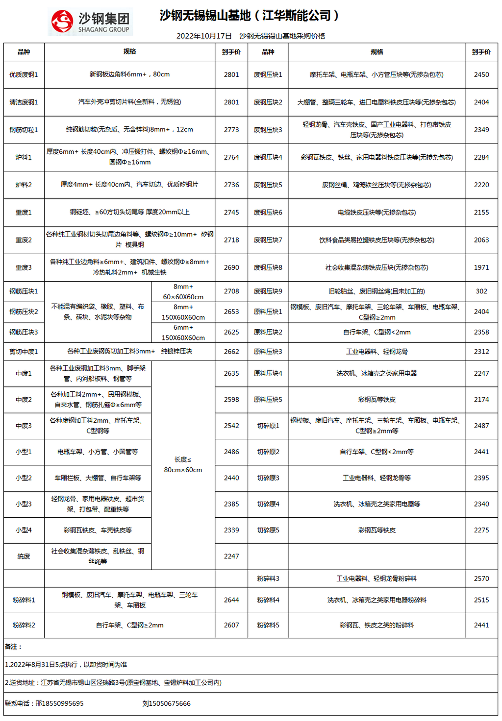 今日沙钢锡山基地 废钢采购报价已更新,有货的朋友欢迎联系我们!