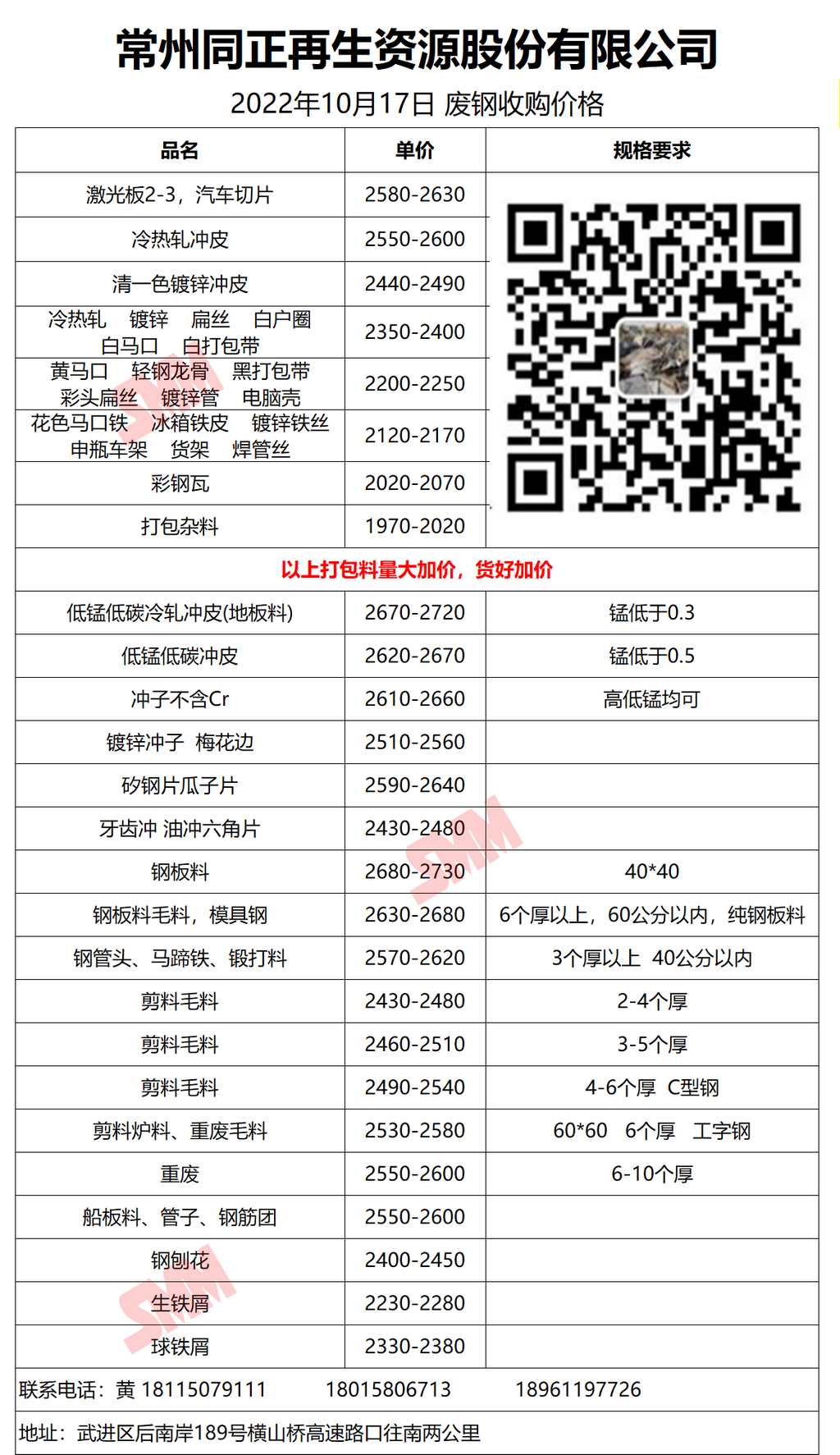 10月17日常州同正再生资源 废钢收购报价