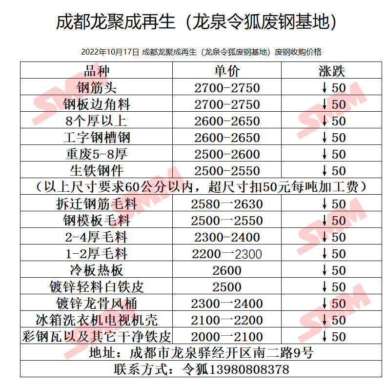 10月17日 成都龙聚成再生 废钢收购价格