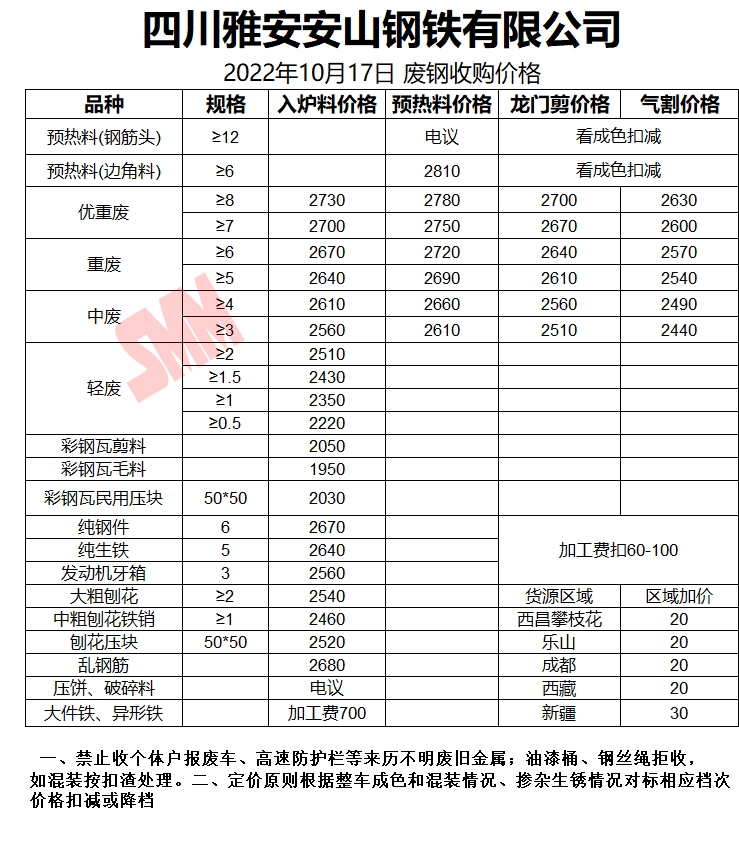 10月17日雅安安山钢铁 废钢收购二次报价