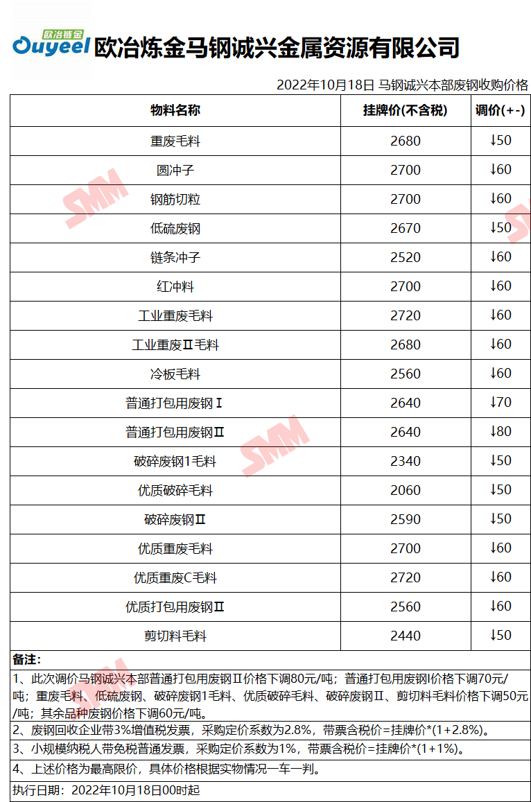 10月18日欧冶链金马钢诚兴 废钢收购报价