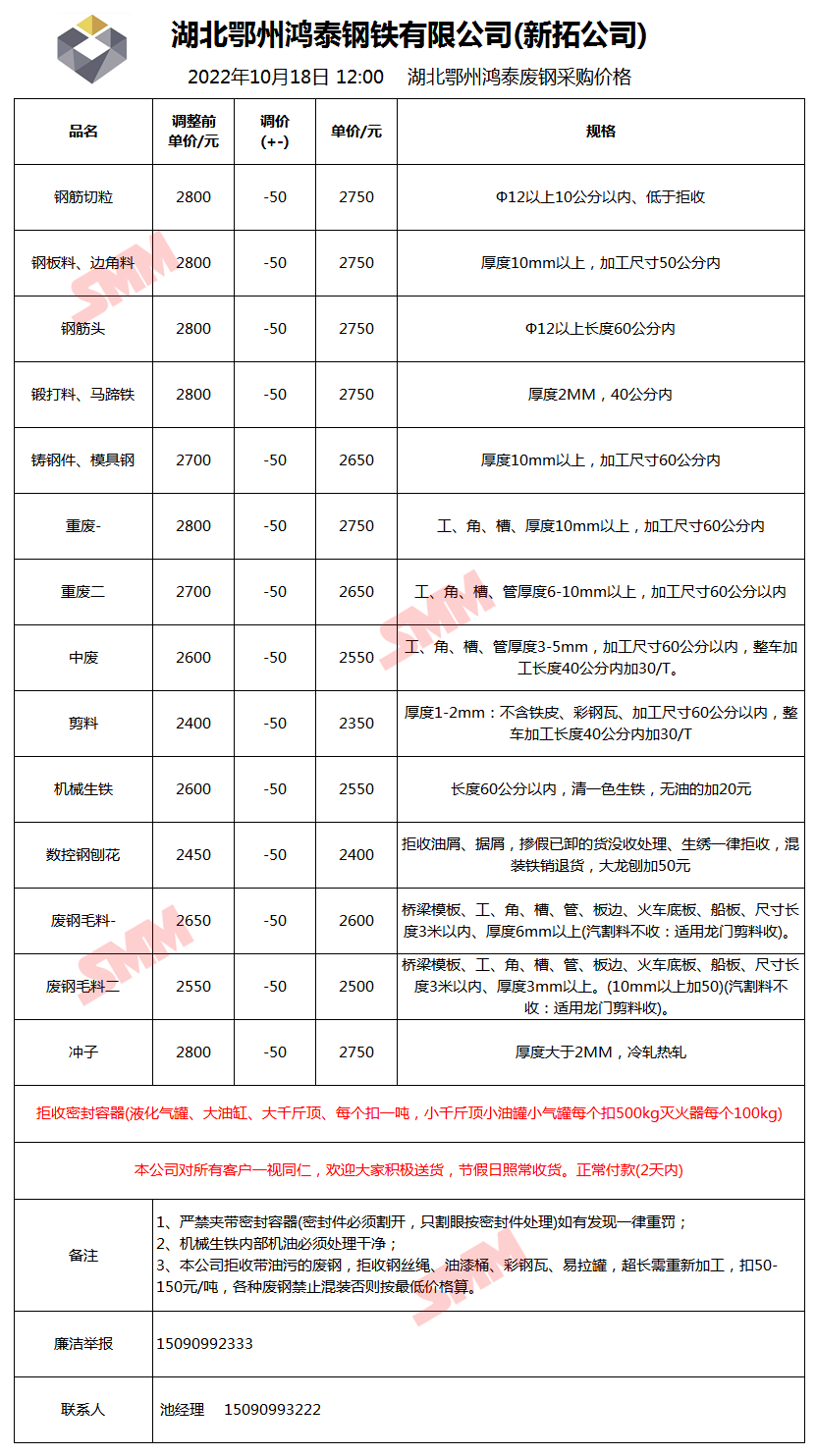 10月18日湖北鄂州鸿泰 废钢采购报价