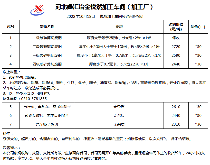 今日 鑫汇冶金悦然(加工厂) 废钢采购报价已更新,有货的朋友欢迎联系我们!
