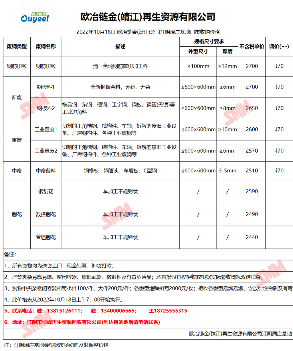 10月18日欧冶链金靖江公司周庄基地 废钢收购报价