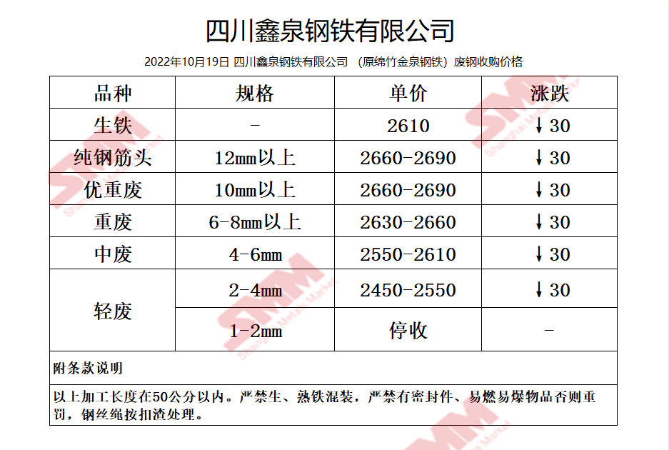 10月19日鑫泉钢铁(原绵竹金泉钢铁) 废钢收购报价
