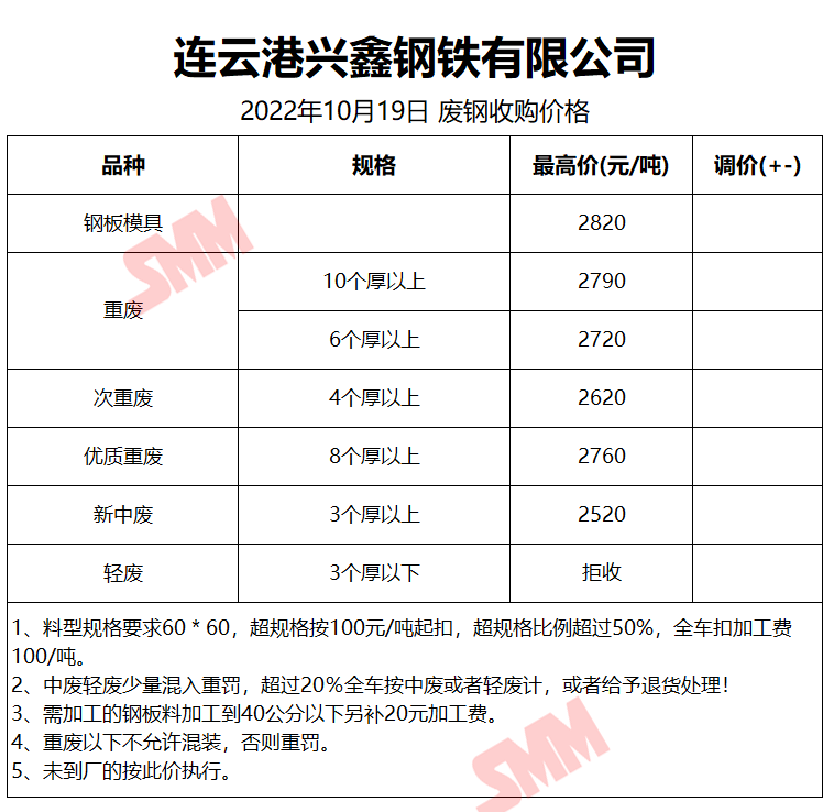 10月19日连云港兴鑫钢铁 废钢收购报价