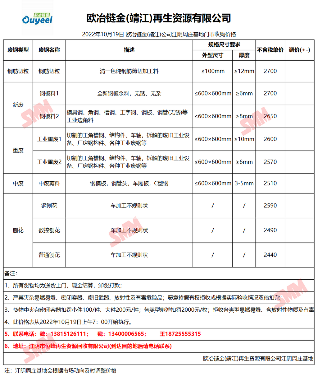 10月19日欧冶链金靖江公司周庄基地 废钢收购报价