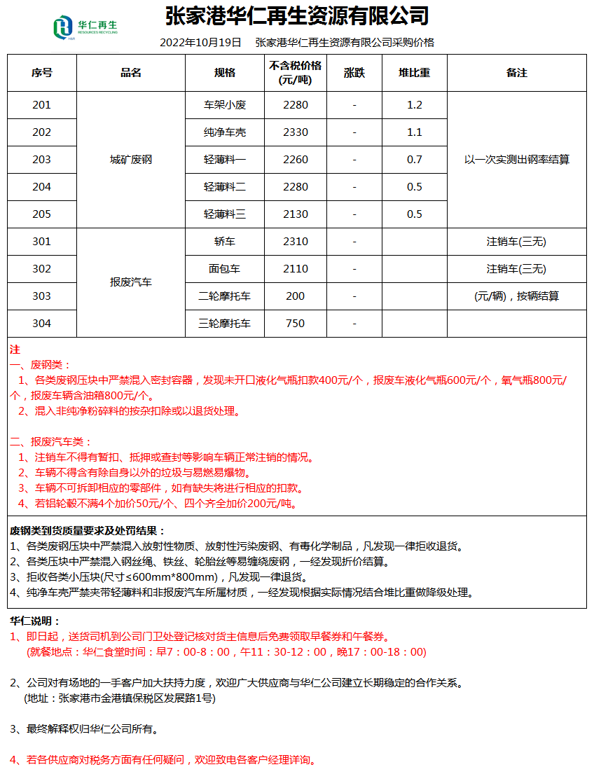 10月19日张家港华仁再生 废钢采购报价