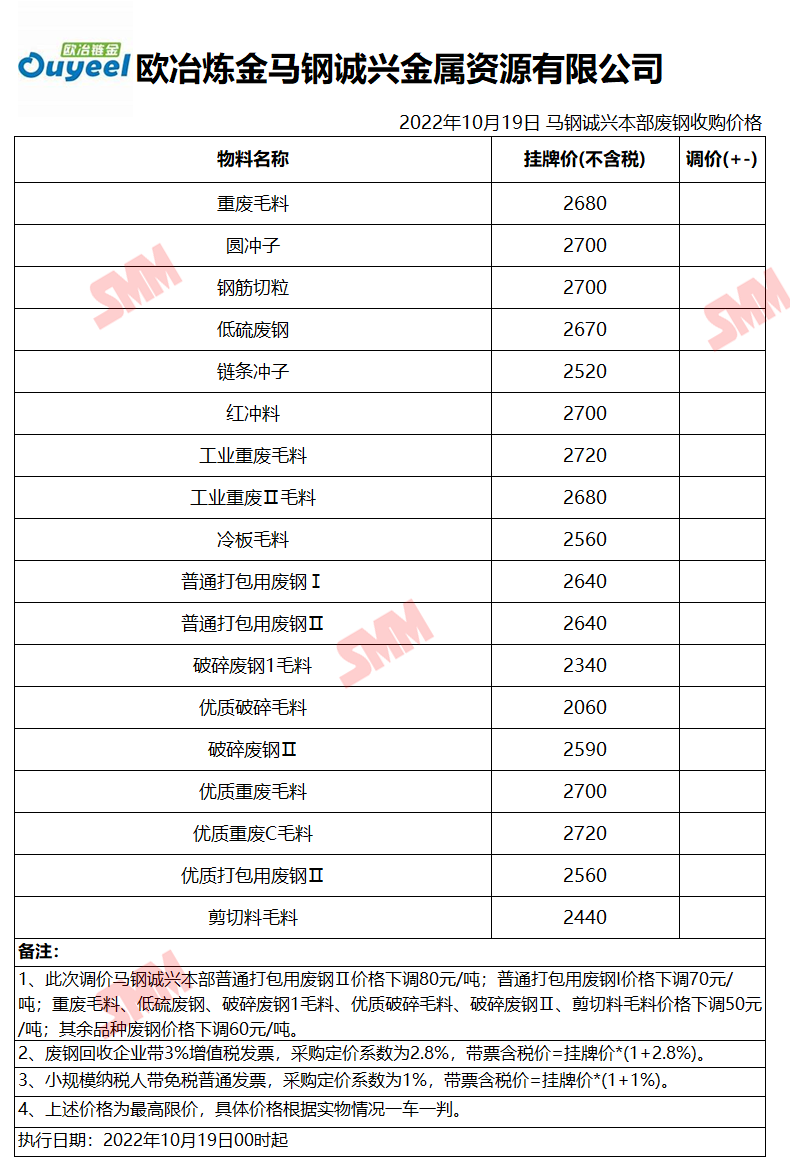 10月19日欧冶链金马钢诚兴 废钢收购报价