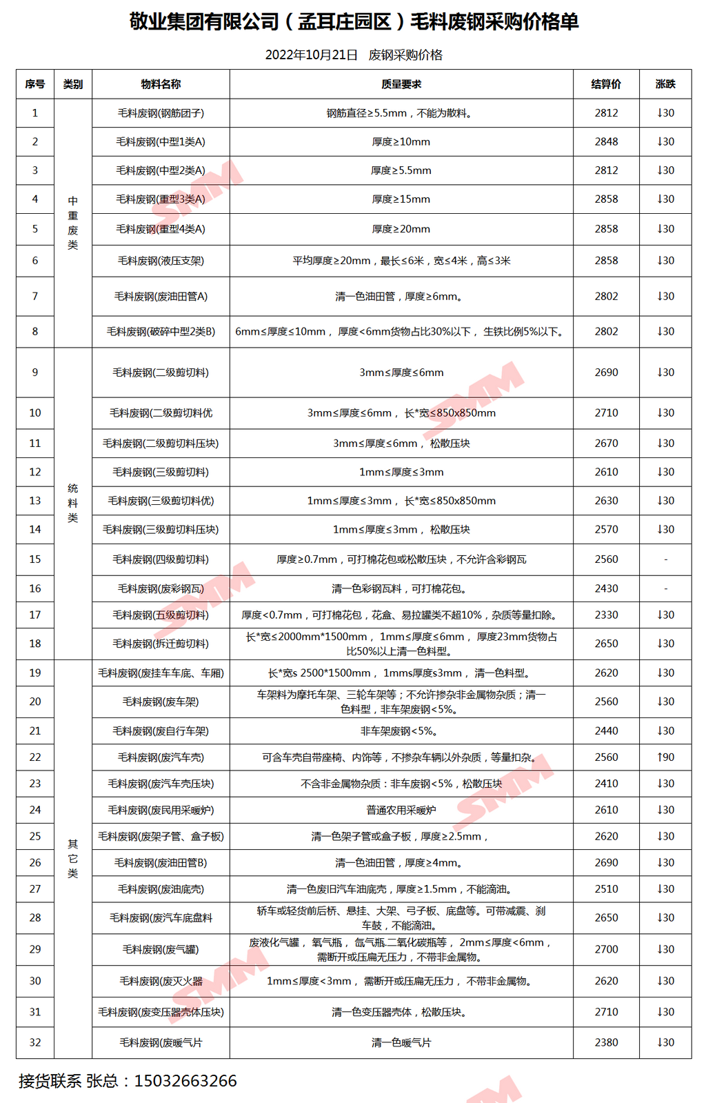 10月21日敬业钢铁(孟耳庄园区) 废钢采购报价