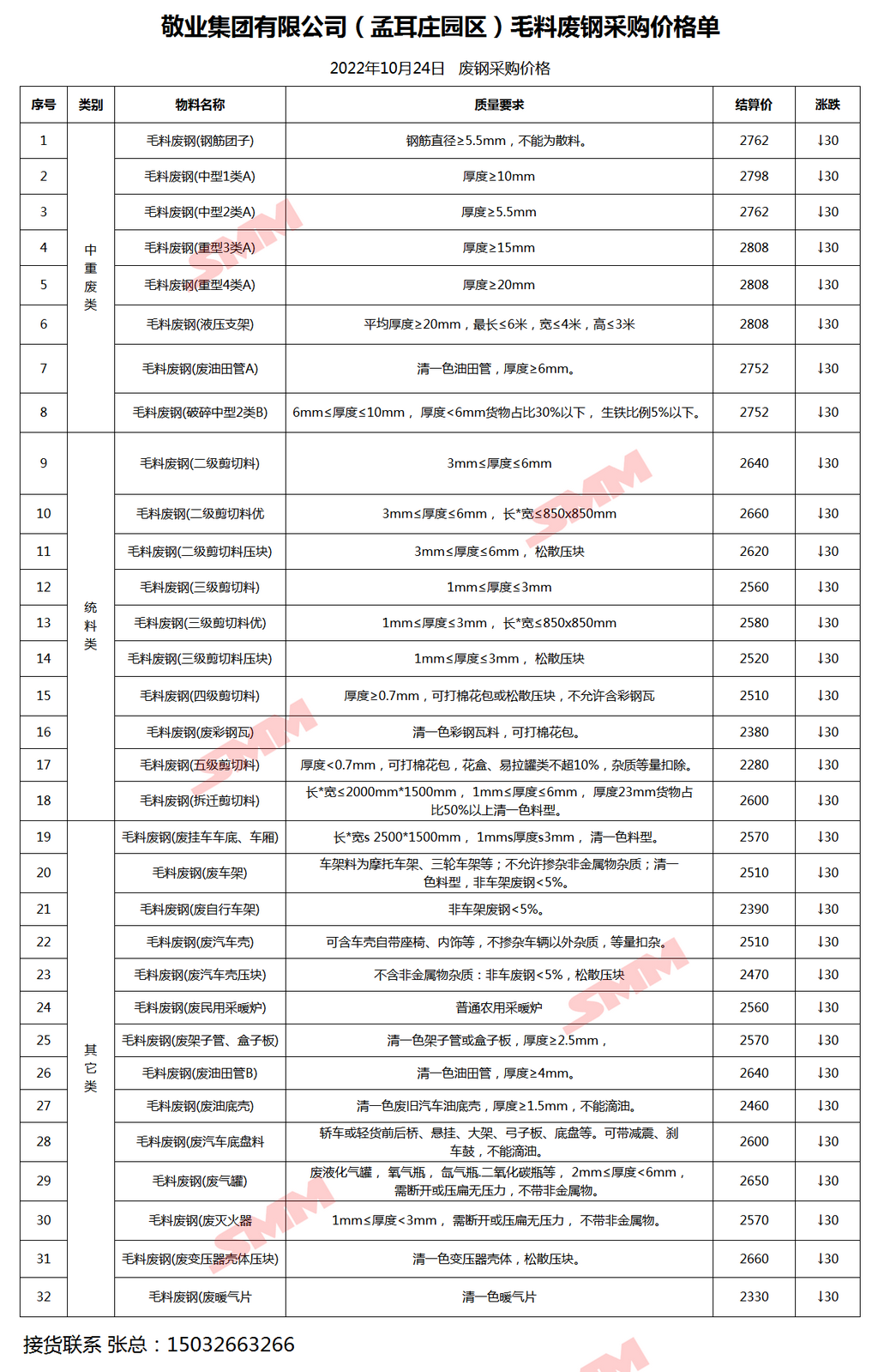 10月24日敬业钢铁(孟耳庄园区) 废钢采购报价
