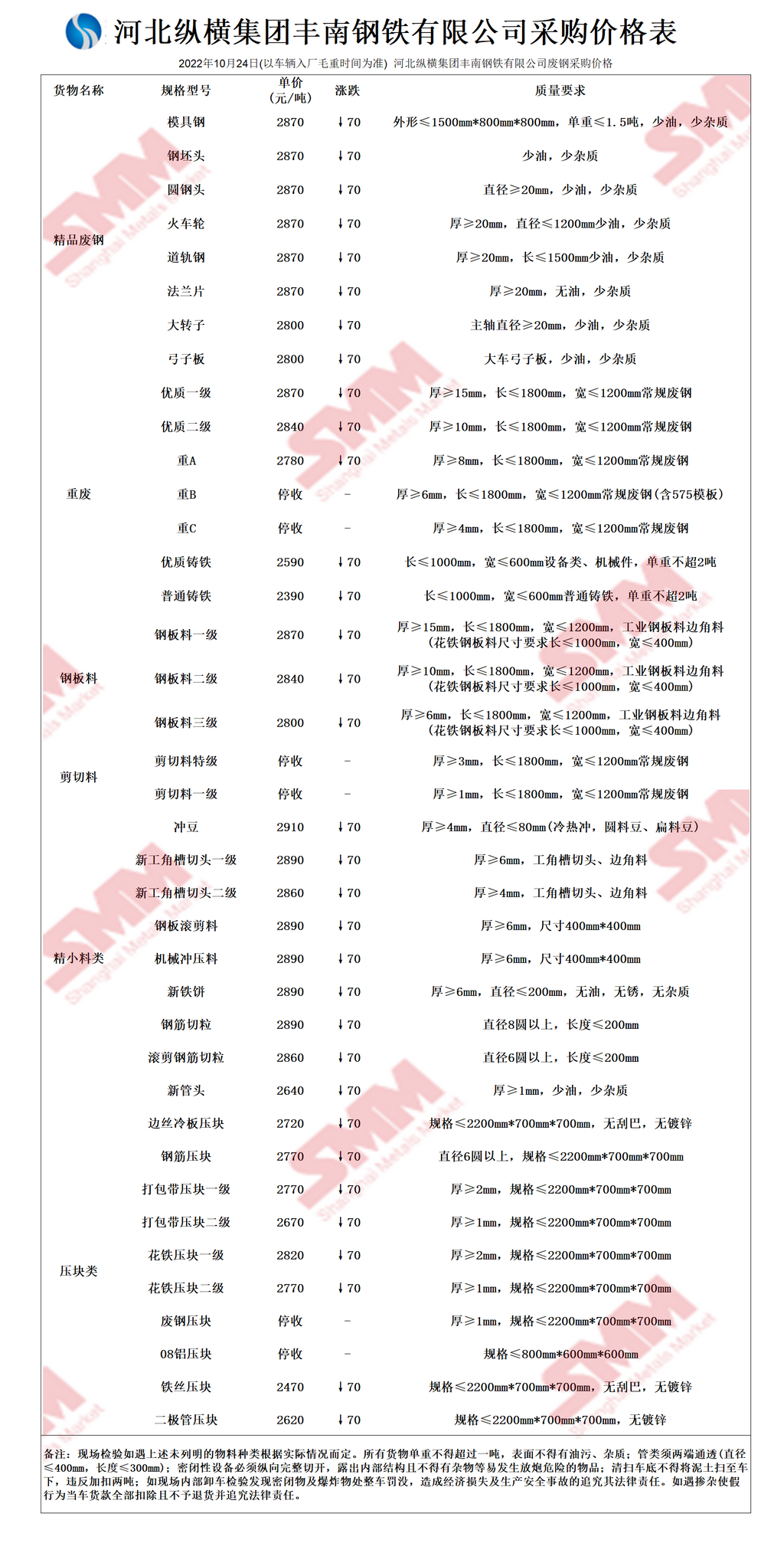10月24日河北纵横集团丰南钢铁 废钢采购报价