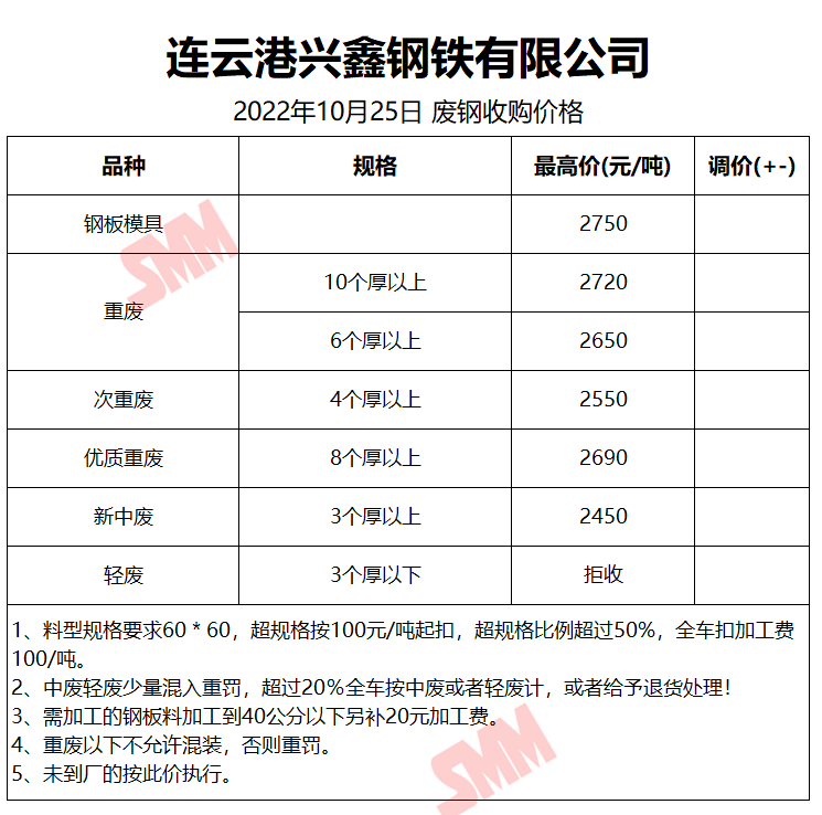 10月25日连云港兴鑫钢铁 废钢收购报价