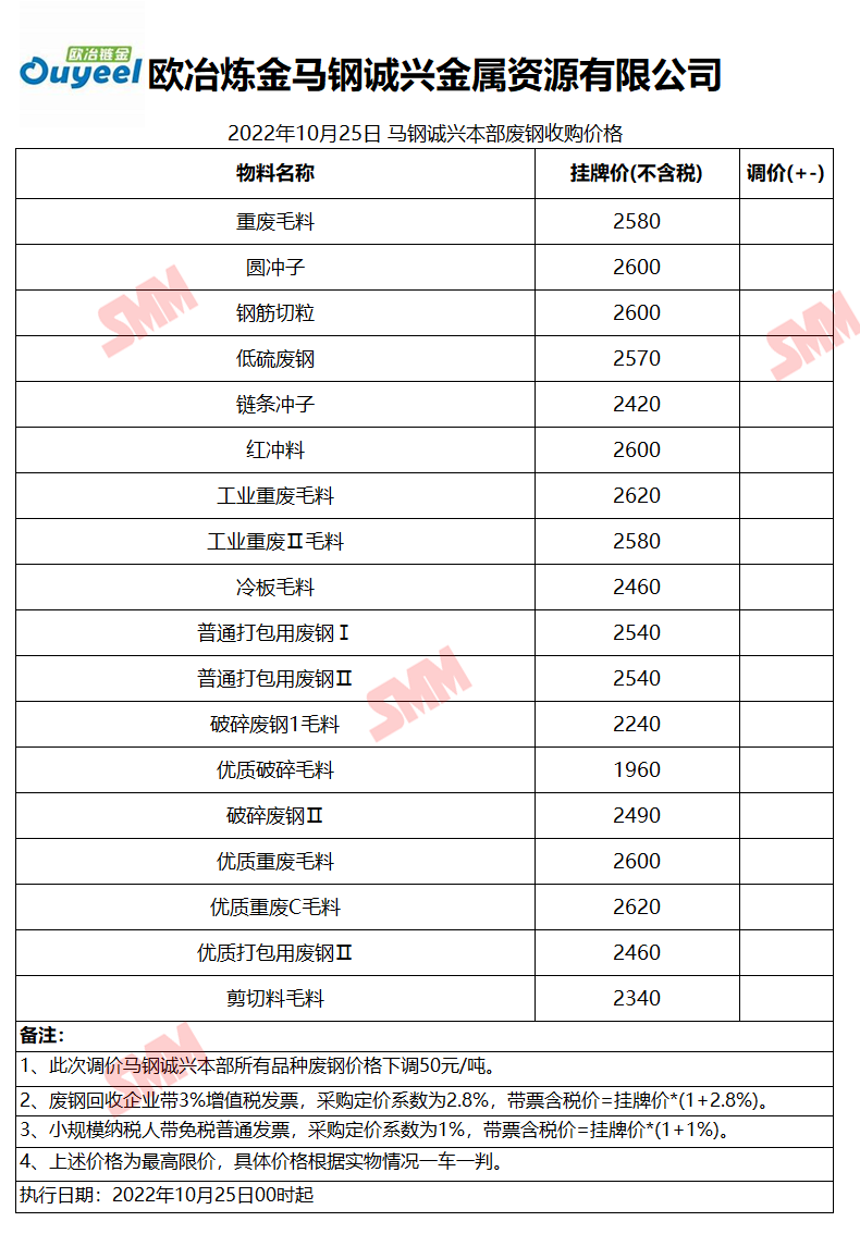 10月25日欧冶链金马钢诚兴 废钢收购报价