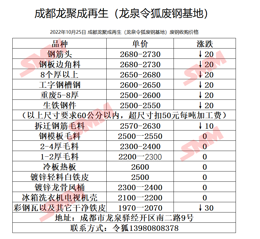 10月25日 成都龙聚成再生 废钢收购价格