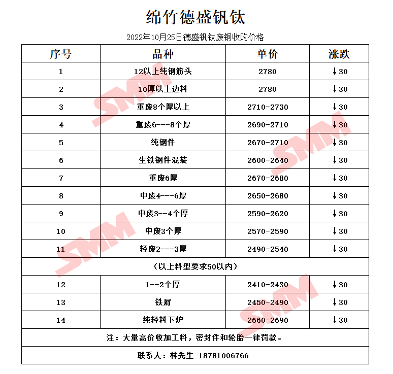 10月25日 绵竹德盛钒钛 废钢收购报价