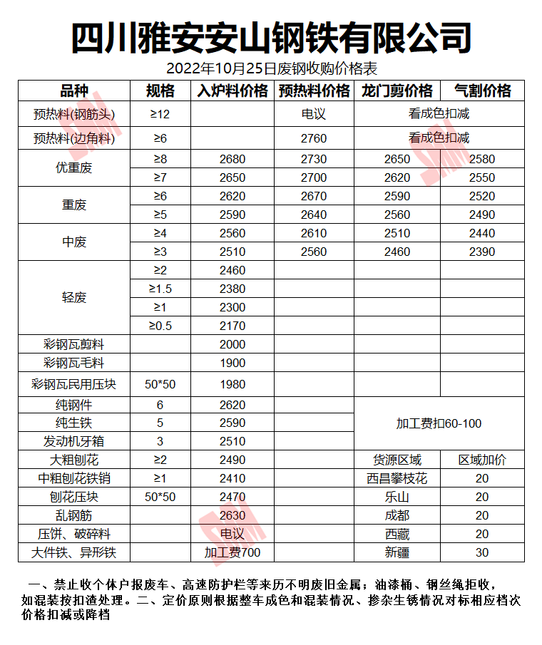 10月25日雅安安山钢铁 废钢收购二次报价