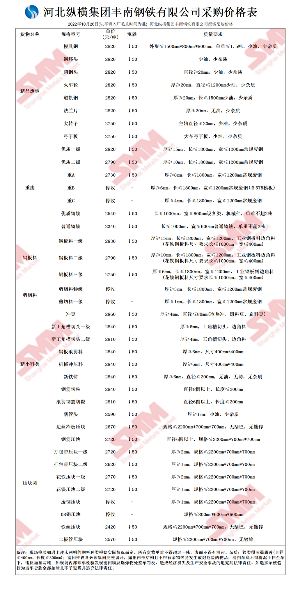 10月26日河北纵横集团丰南钢铁 废钢采购报价