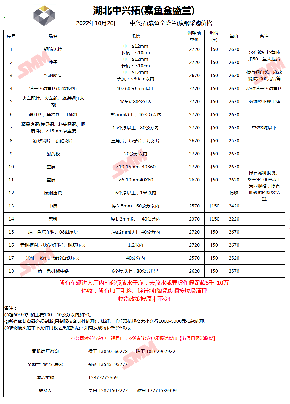 10月26日湖北中兴拓(嘉鱼金盛兰) 废钢采购报价