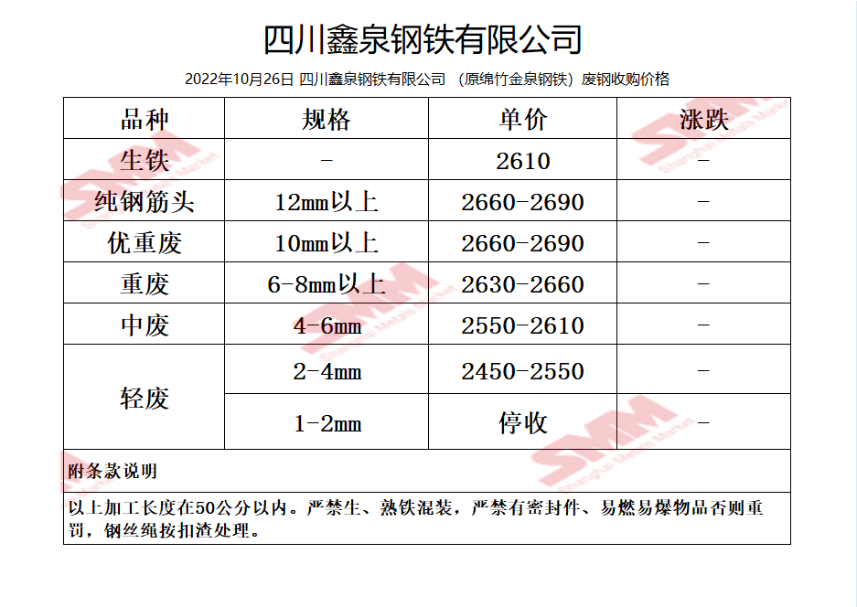 10月26日鑫泉钢铁(原绵竹金泉钢铁) 废钢收购报价