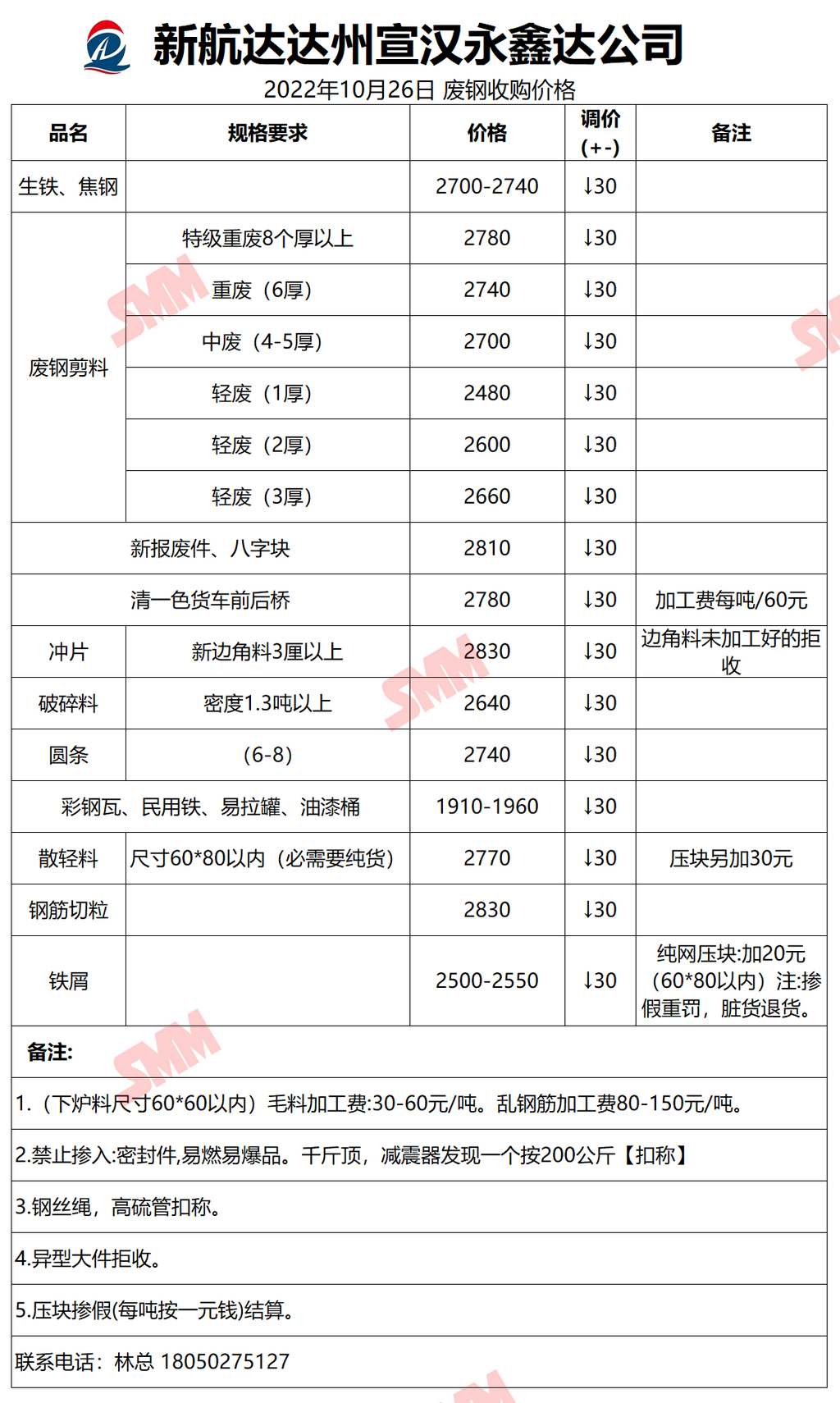 10月26日达州宣汉永鑫达 废钢收购二次报价