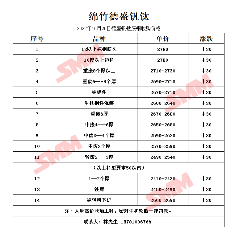10月26日 绵竹德盛钒钛 废钢收购报价