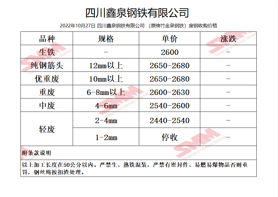 10月27日鑫泉钢铁(原绵竹金泉钢铁) 废钢收购报价