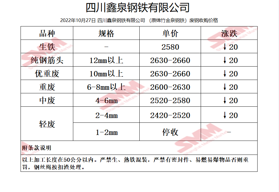 10月27日鑫泉钢铁(原绵竹金泉钢铁) 废钢收购第二次报价
