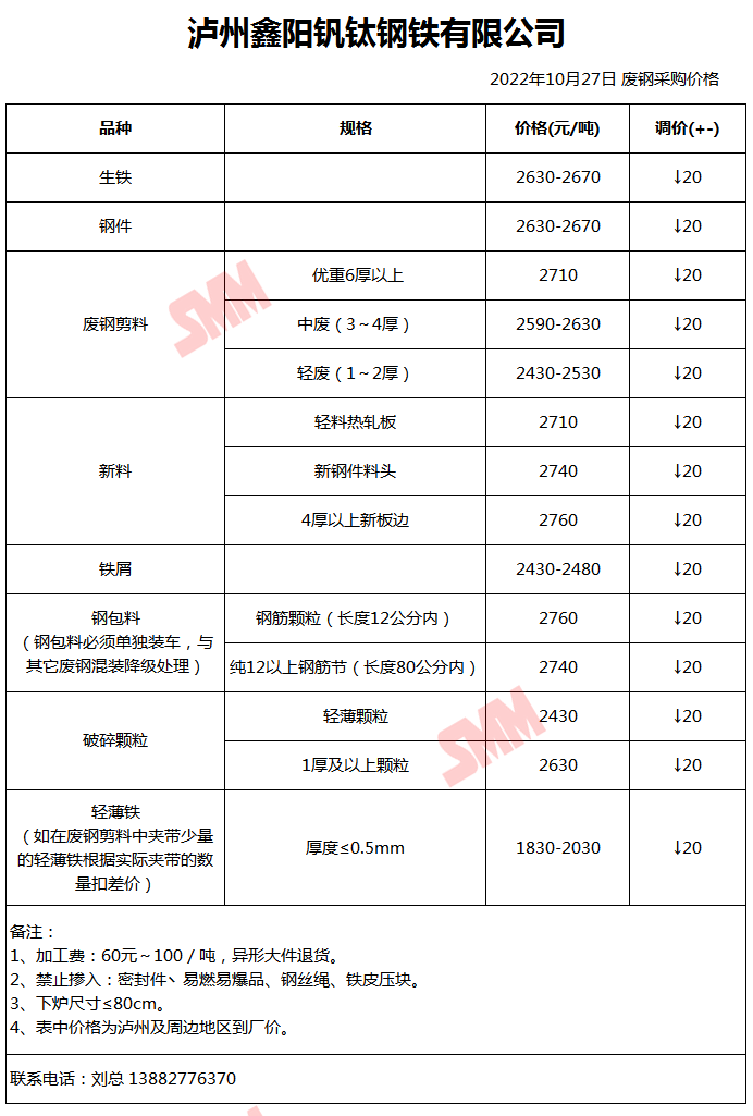 10月27日泸州鑫阳钒钛 废钢采购报价