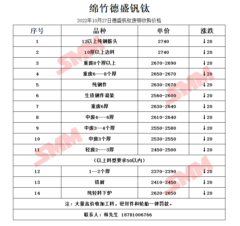 10月27日 绵竹德盛钒钛 废钢收购报价