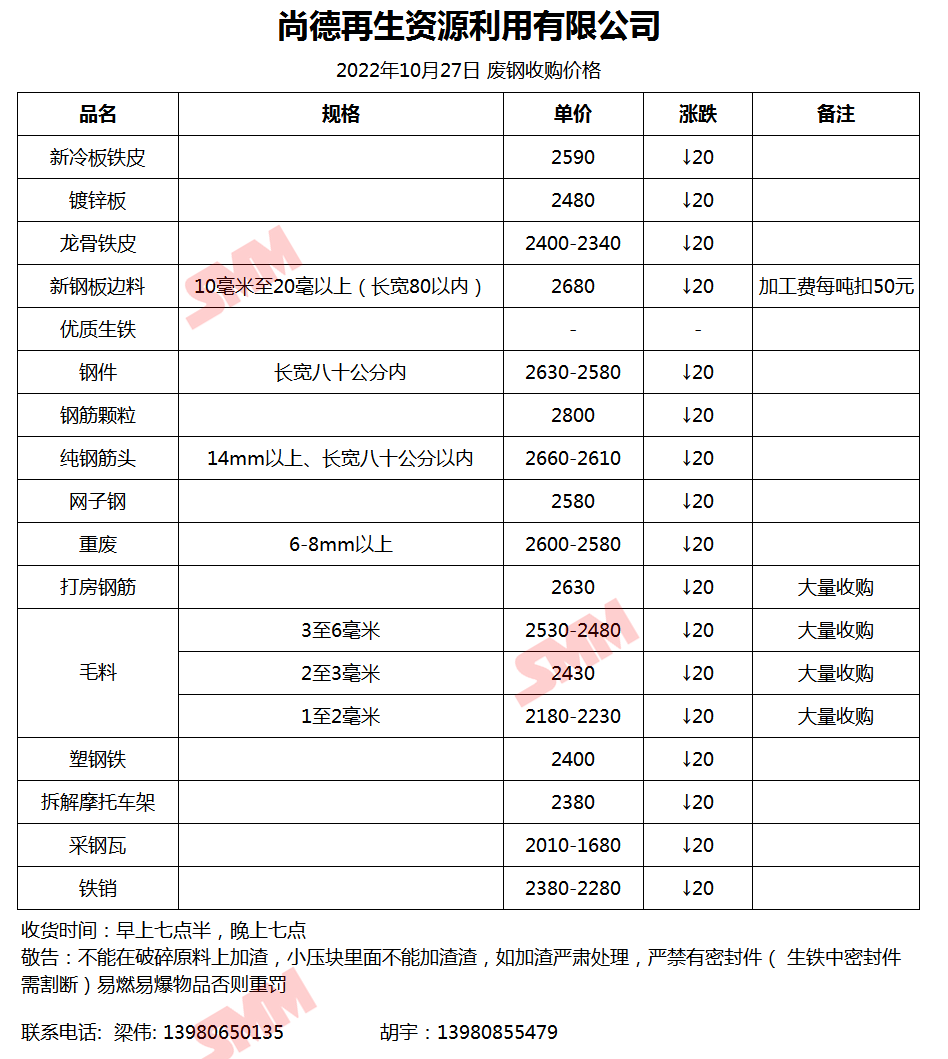 今日 尚德再生资源 废钢收购价格已更新,有货的朋友欢迎联系我们!