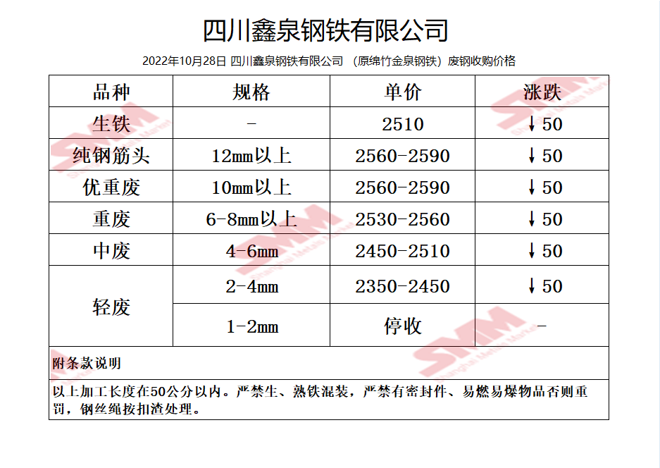 10月28日鑫泉钢铁(原绵竹金泉钢铁) 废钢收购报价