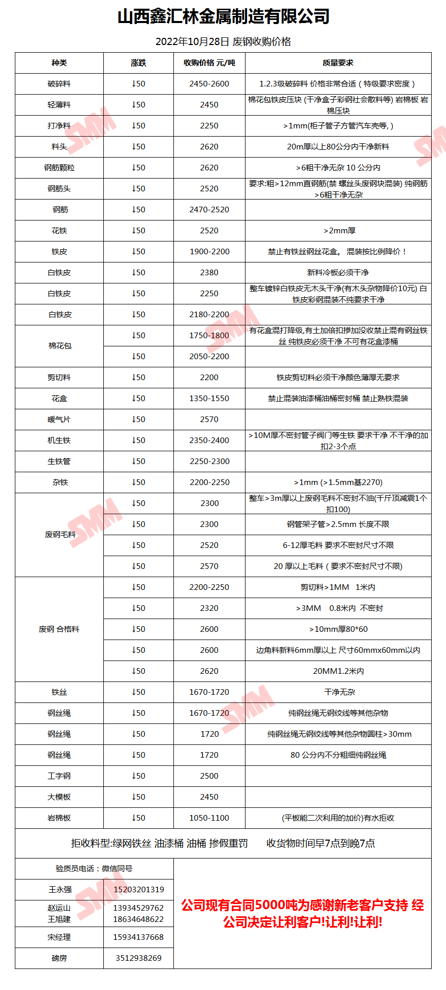 今日山西鑫汇林金属制造有限公司 废钢收购报价已更新,有货的朋友欢迎联系我们!