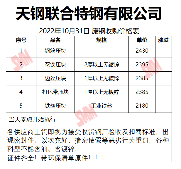 10月31日天钢联合特钢 废钢收购报价