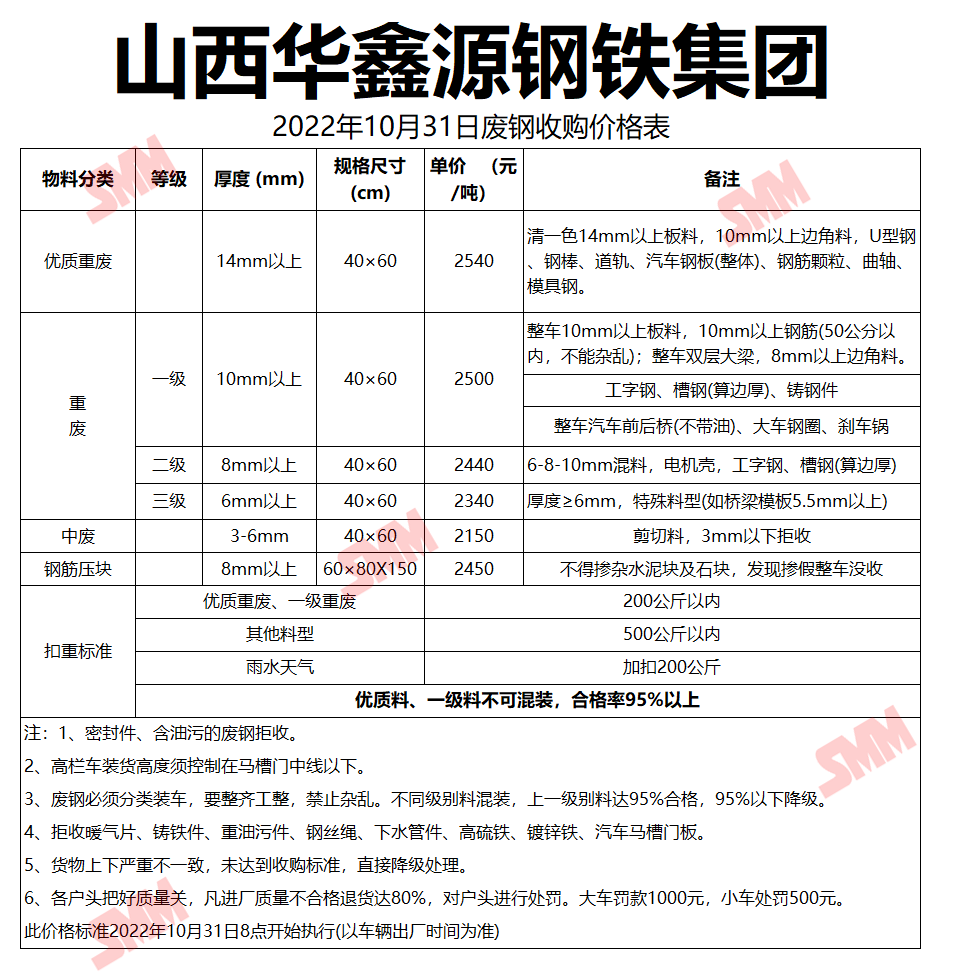 10月31日山西华鑫源钢铁 废钢收购报价