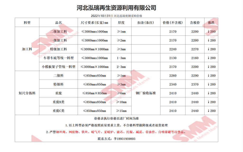 10月31日泓瑞再生 废钢采购报价