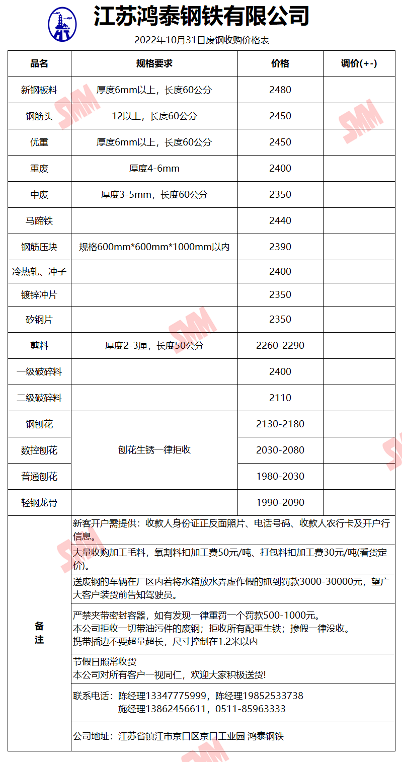 10月31日江苏鸿泰钢铁 废钢收购报价