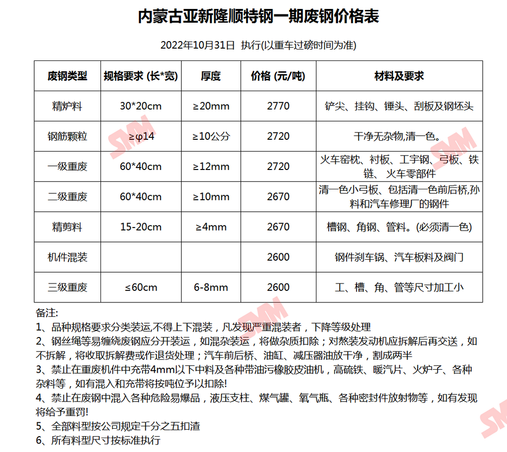 10月31日 内蒙古亚新隆顺特钢一期 废钢收购价格