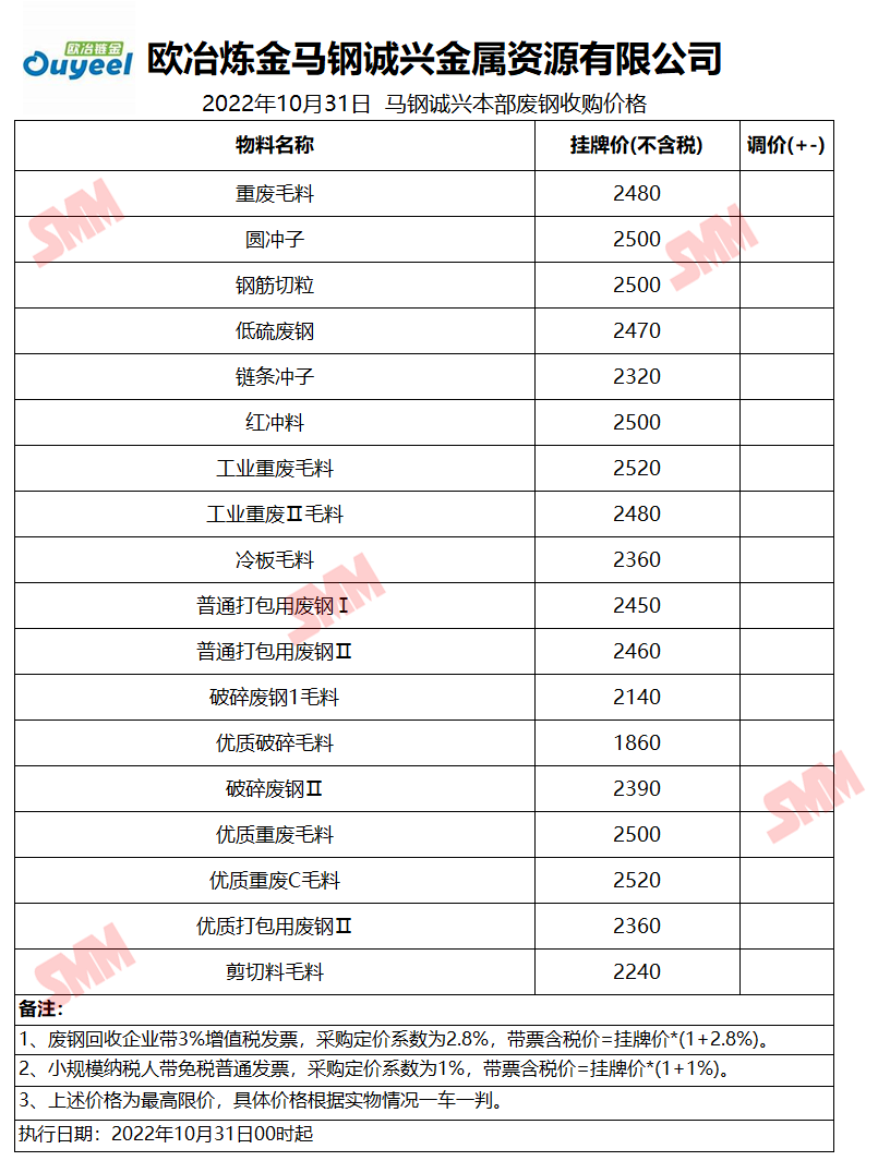 10月31日欧冶链金马钢诚兴 废钢收购报价