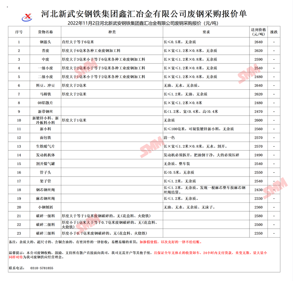 11月2日河北鑫汇冶金 废钢采购报价