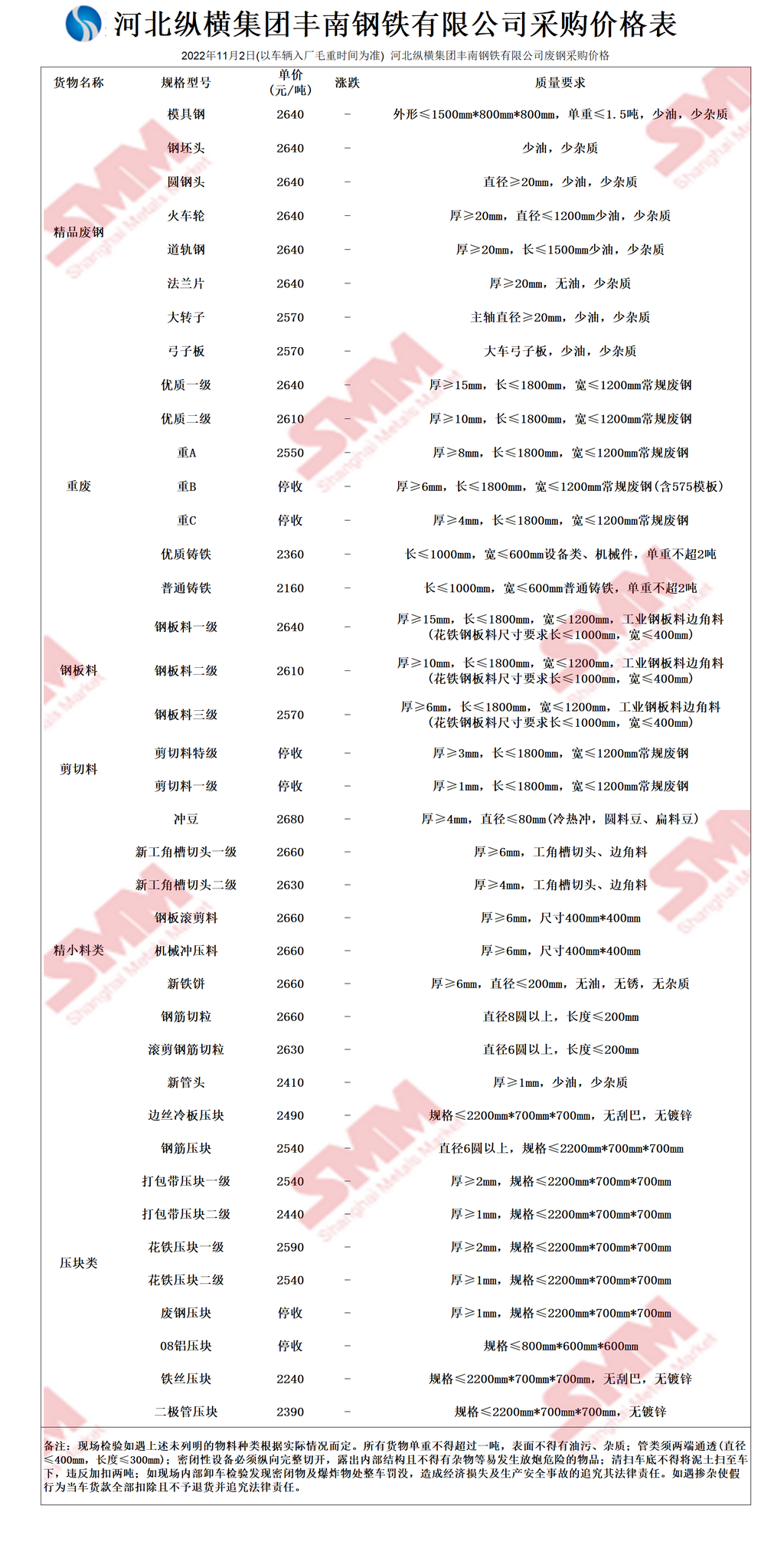 11月2日河北纵横集团丰南钢铁 废钢采购报价