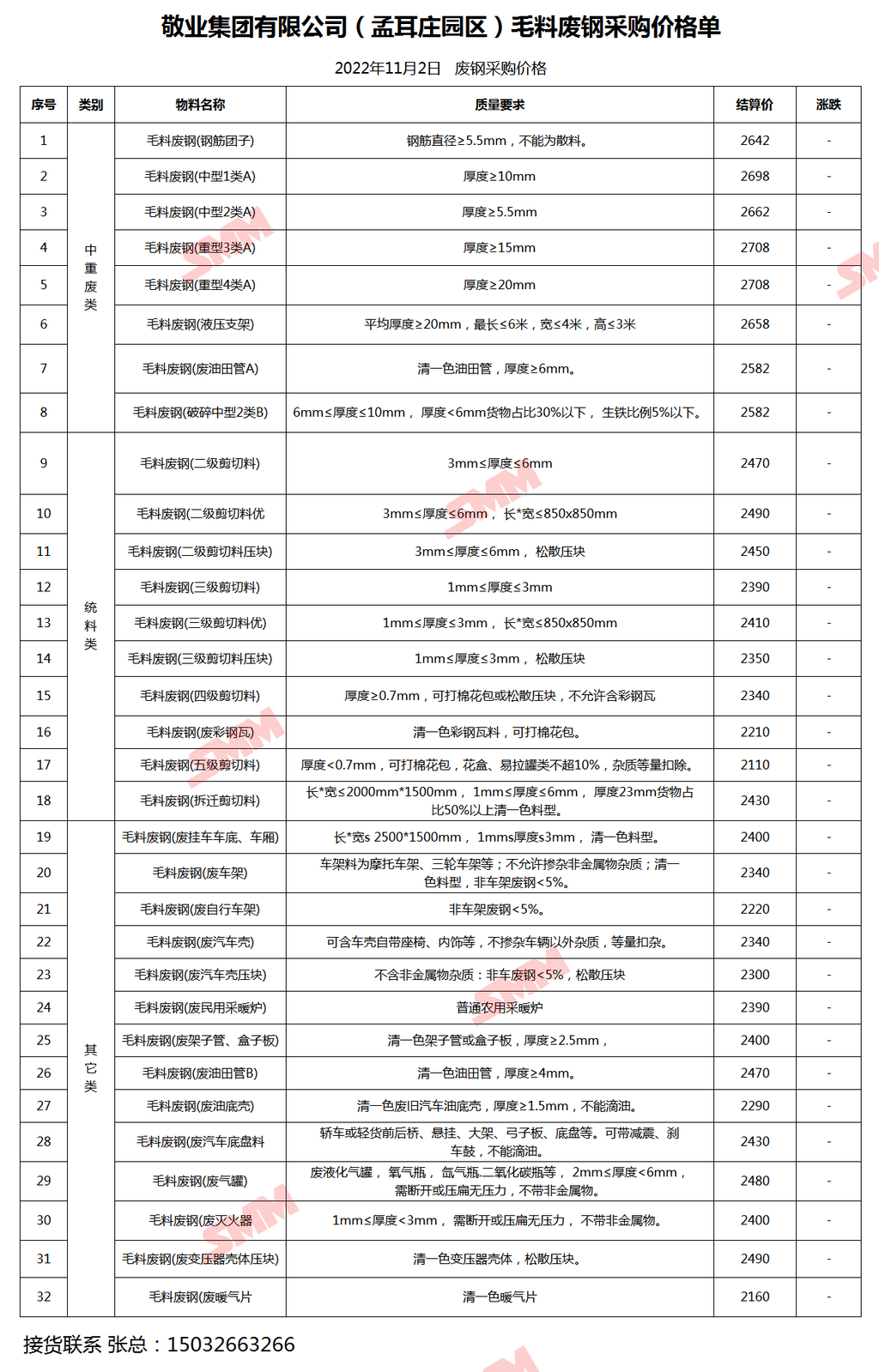 11月2日敬业钢铁(孟耳庄园区) 废钢采购报价