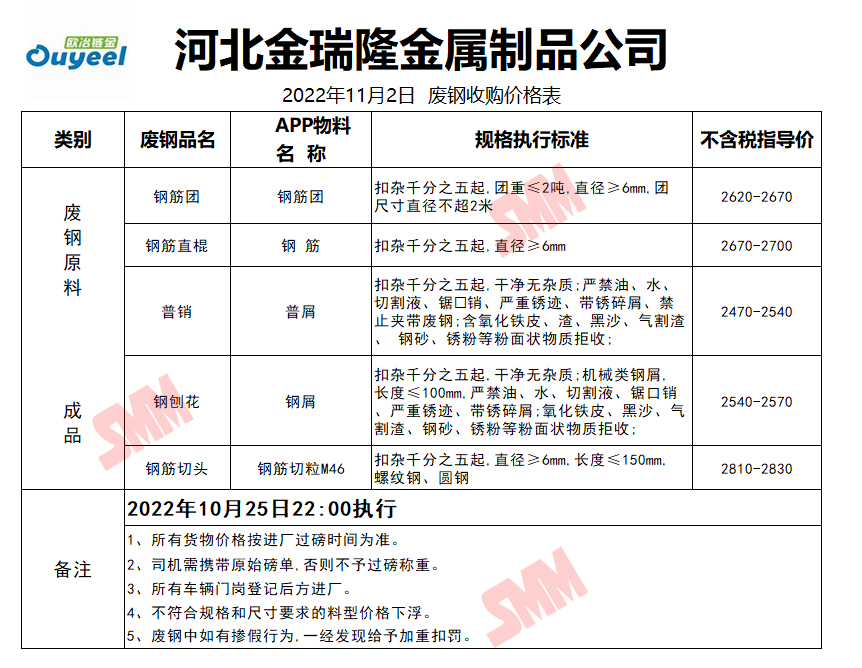 11月2日河北金瑞隆钢铁 废钢收购报价