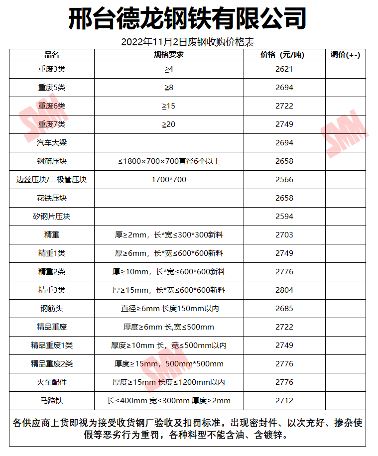 11月2日邢台德龙钢铁 废钢收购报价
