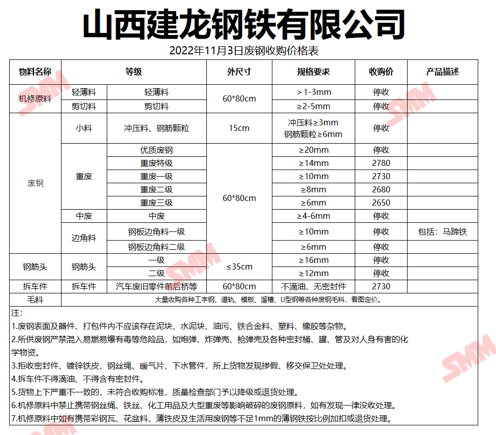 11月3日山西建龙钢铁 废钢收购报价