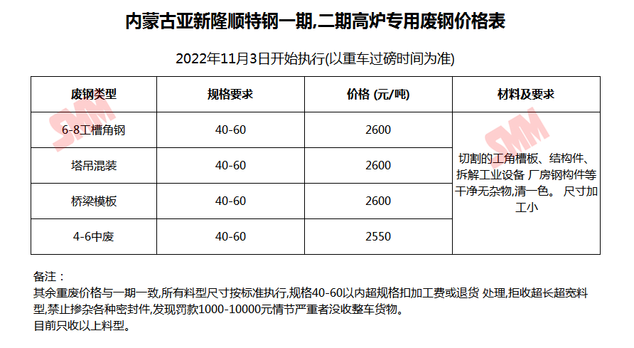 11月3日 内蒙古亚新隆顺特钢一期,二期 废钢收购价格